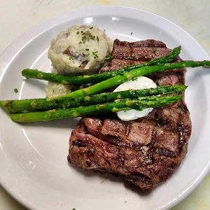 - Ribeye cooked to order with garlic mashed potatoes and asparagus.