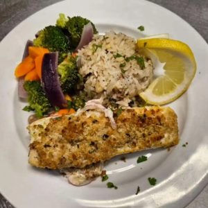 - Crusted halibut dipped in house made panko and caesar dressing